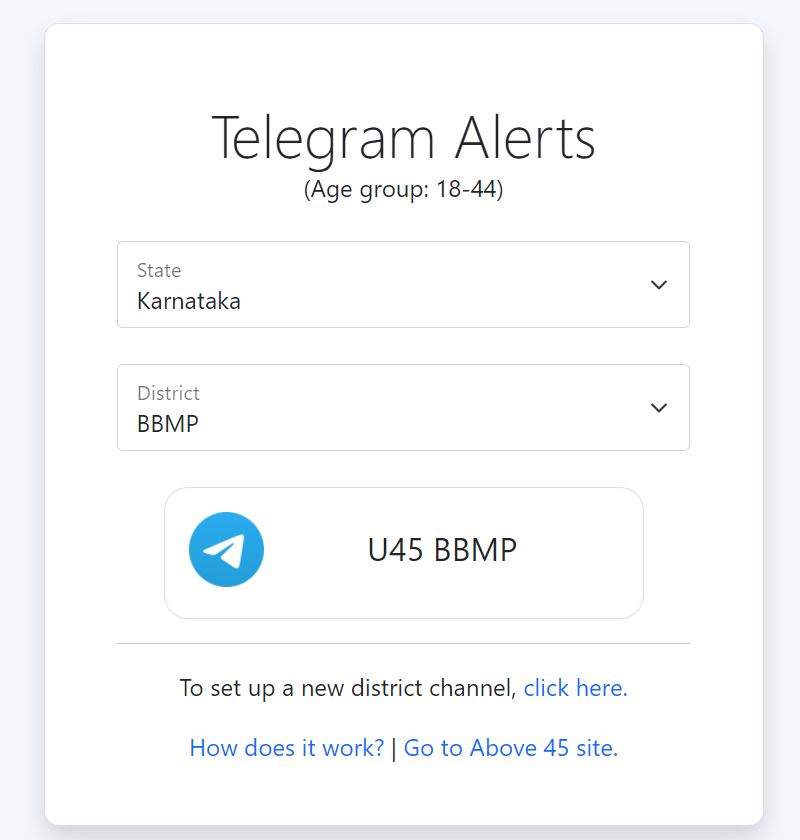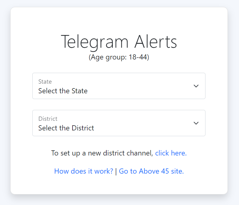 One tool users can try is a website called Under45.in created by developer Berty Thomas. Targeted particularly at users in the 18-44 age bracket, Under45 has a feature that will alert users on Telegram when a vaccination slot is available in a centre near them.