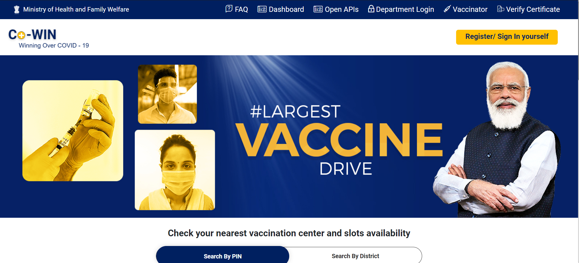 You can search in Co-WIN portal (or Aarogya Setu) for the vaccination centre nearest to your location by either searching through PIN code or by choosing the State and the District.